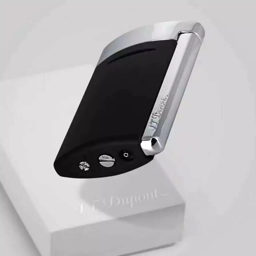Megajet es S.T. El nuevo encendedor clásico de Dupont. Los fumadores de cigarros que buscan rendimiento, eficiencia y velocidad admirarán su diseño minimalista, su gran tamaño y su generosa llama plana. Megajet black es la combinación perfecta de ergonomía y tecnología. Potente llama azul. Llama grande plana de 20 mm. 3 entradas de aire con carbón activo. Tamaño ergonómico.